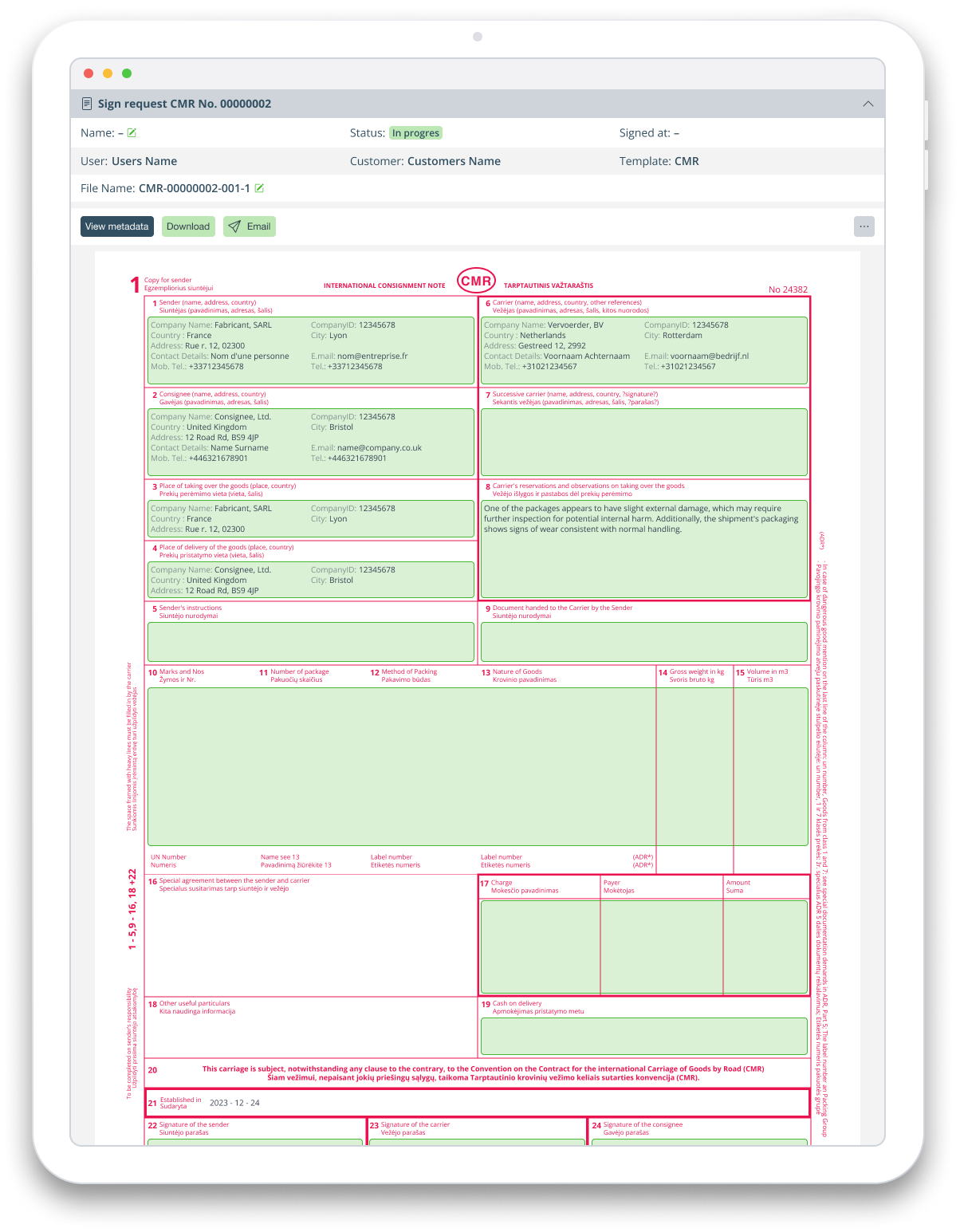 All three CMR parties — Consignor, Carrier, and Consignee — can sign the CMR online or on a tablet.